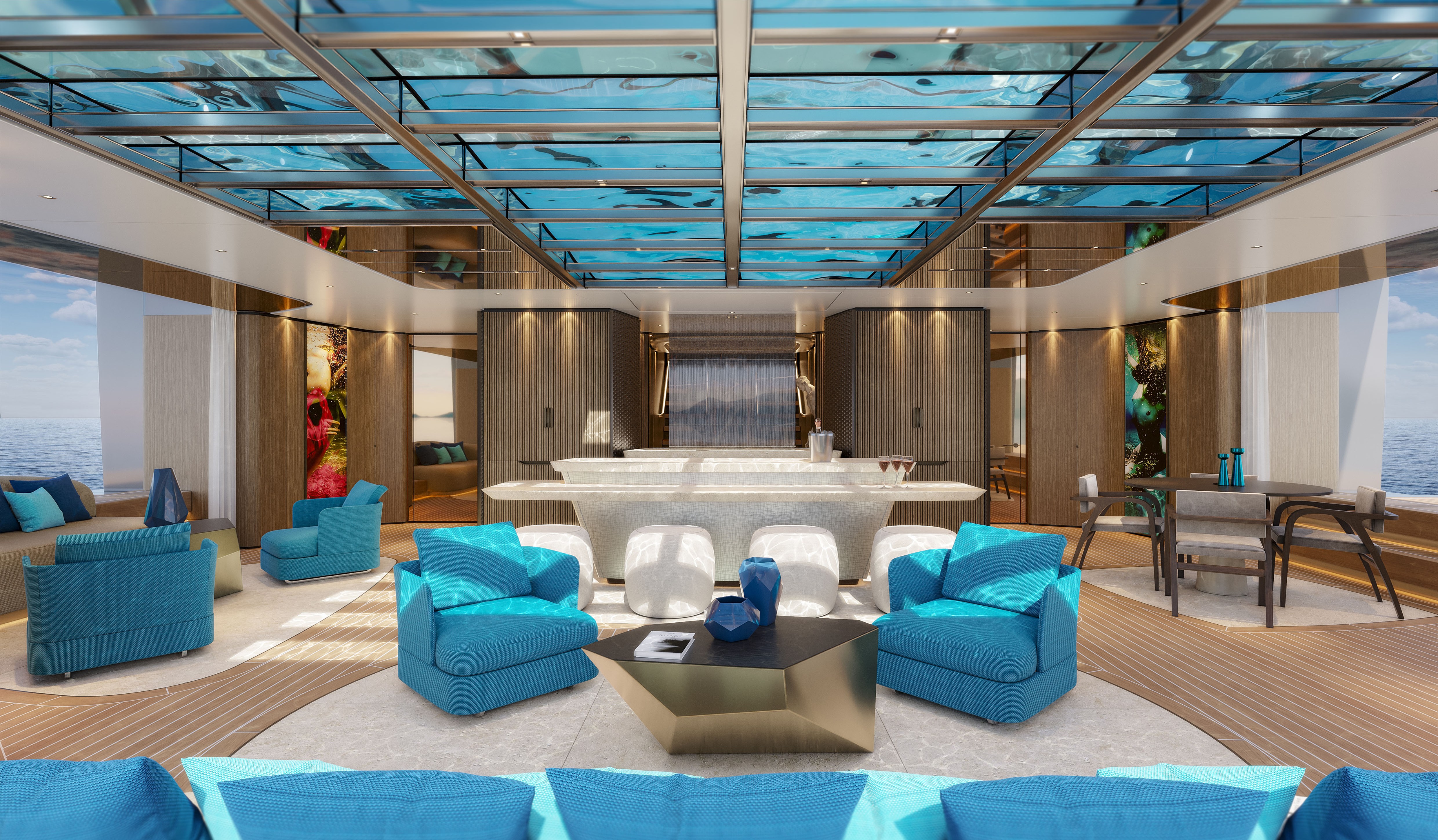 Палуба владельца — более 300 м², включая частный кабинет, лаундж, два спа-санузла, террасу с джакузи и отдельную столовую.